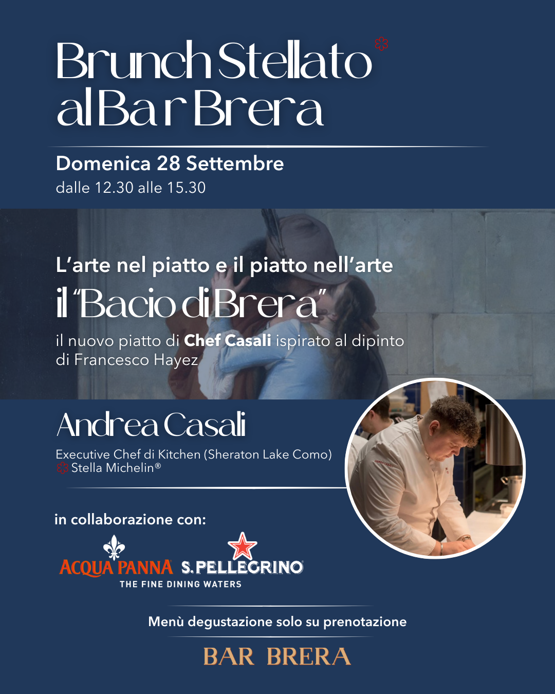The appointment with the star chef brunch and Chef Casali is set for Sunday, September 28 from 12:30 PM to 3:30 PM at Bar Brera, Via Brera 23, Milan. The historic Milanese venue will celebrate art in all its forms: a tribute to the history and expressive soul of one of the most symbolic places in the city, long a crossroads of creativity and beauty. The event, organized to mark the inauguration of Bar Brera’s new kitchen and thanks to the collaboration with SanPellegrino and Michelin-starred chef Andrea Casali, will feature a tasting menu, available by reservation only.