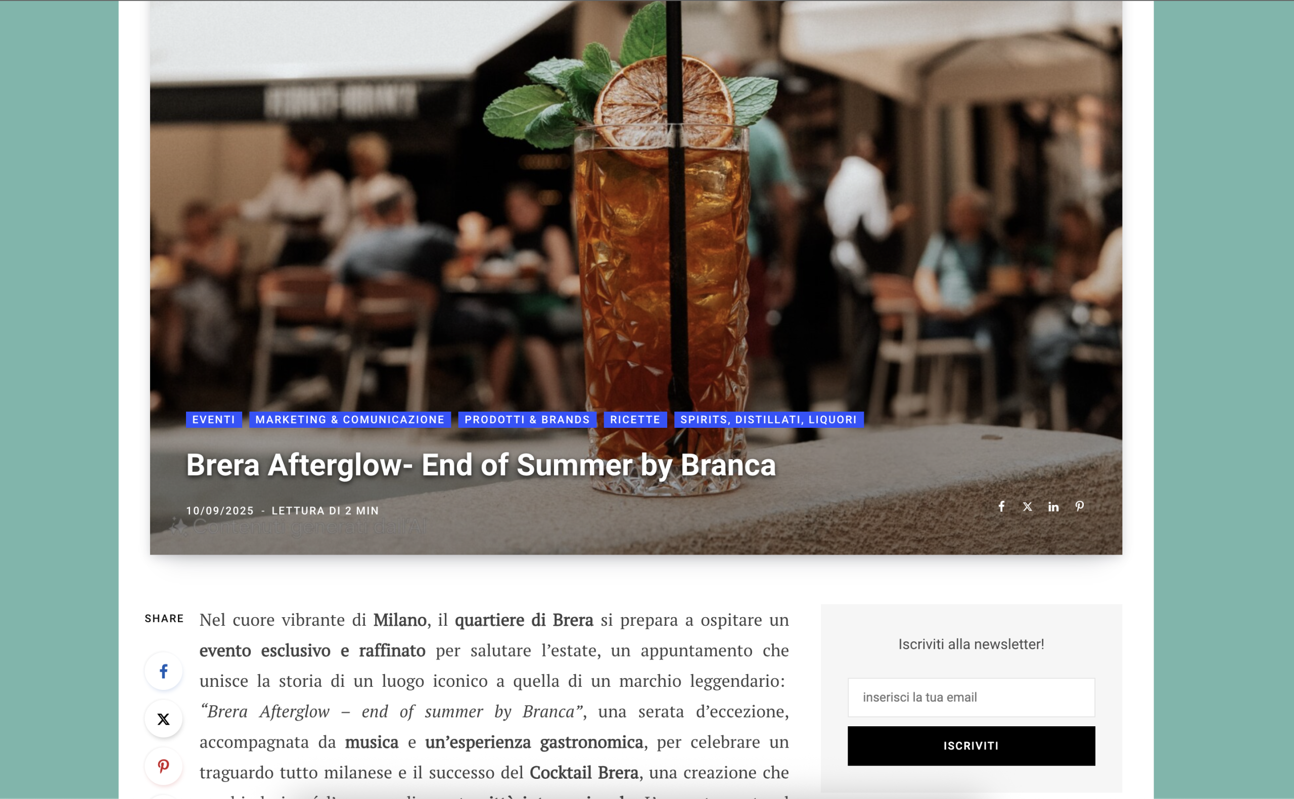 30/10/2023 – Il cocktail Brera nasce con l’obiettivo di offrire l’idea di far parte di un progetto di valorizzazione storica e culturale di un brand celebre nel mondo mutuando dalla mixology l’idea di un’esperienza totalizzante in cui trovare convivio, storia e arte....
