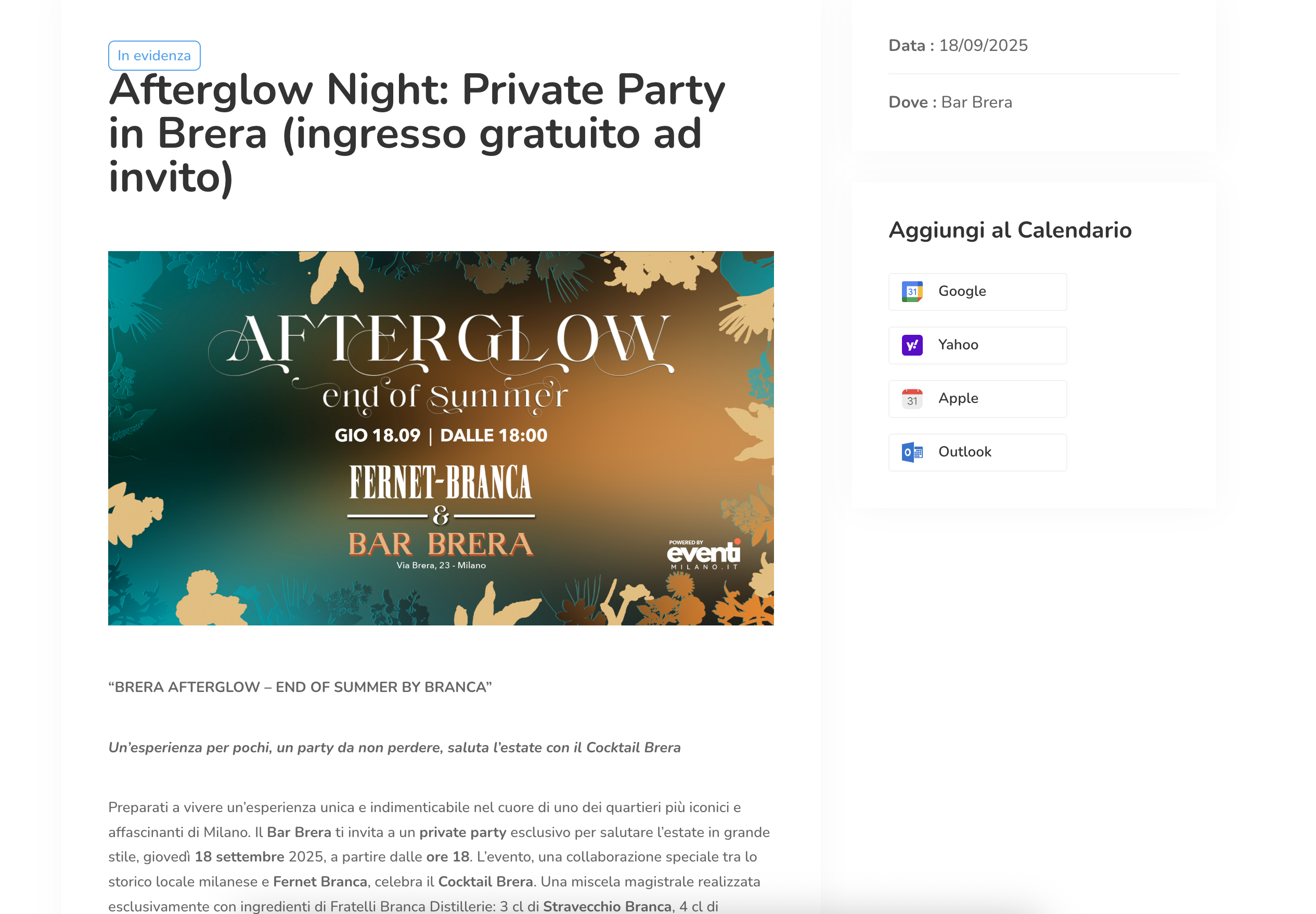 21/03/2024 - Festa di Primavera a sostegno dei City Angels Giovedì 21 marzo 2024 il Bar Brera di Milano (via Brera 23) ospita la prima edizione della Festa di Primavera: a partire dalle ore 18.00 una serata per dare il benvenuto alla bella stagione e sostenere i City Angels, associazione composta da volontari nata a Milano nel 1994 su iniziativa di Mario Furlan...