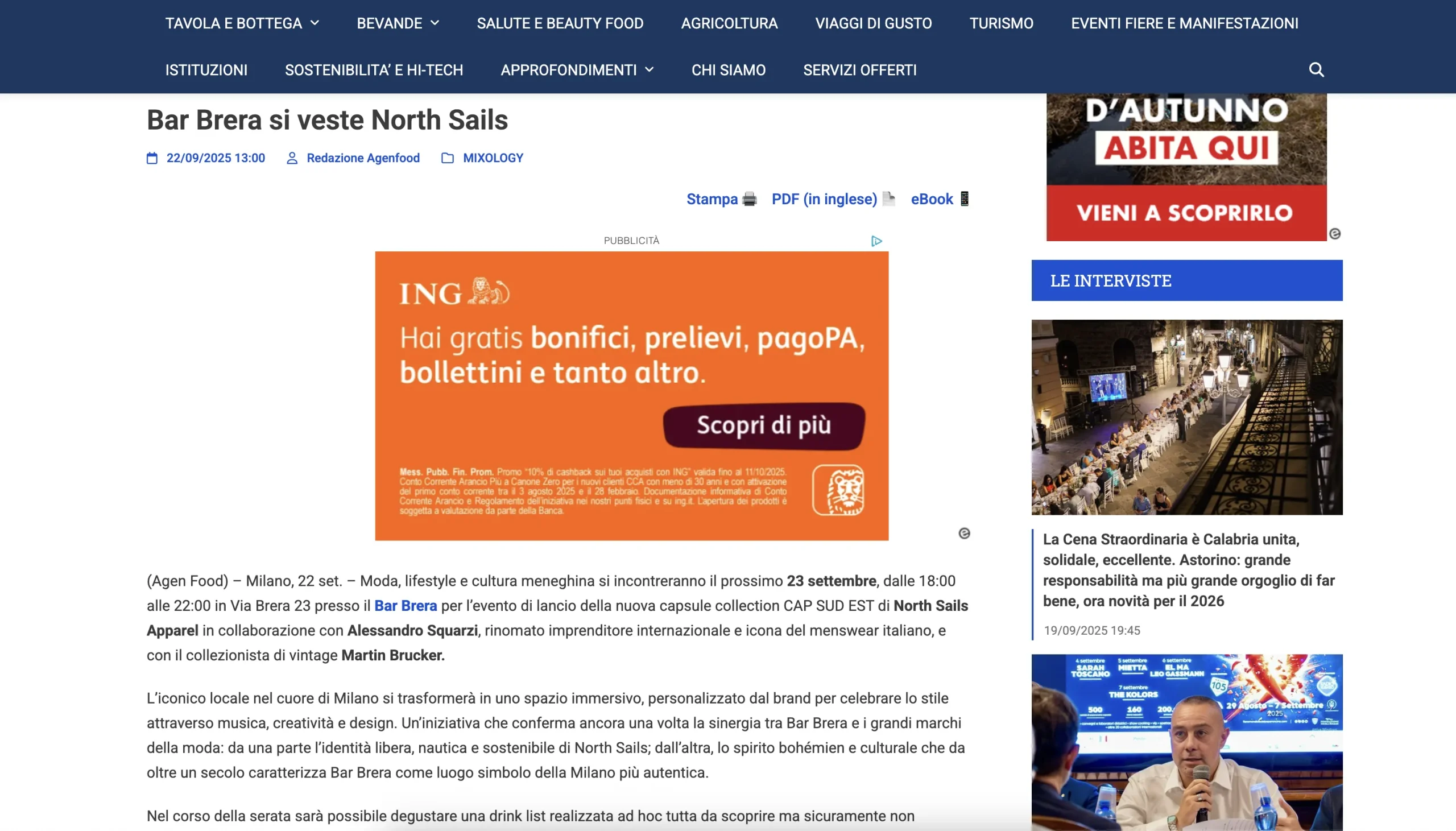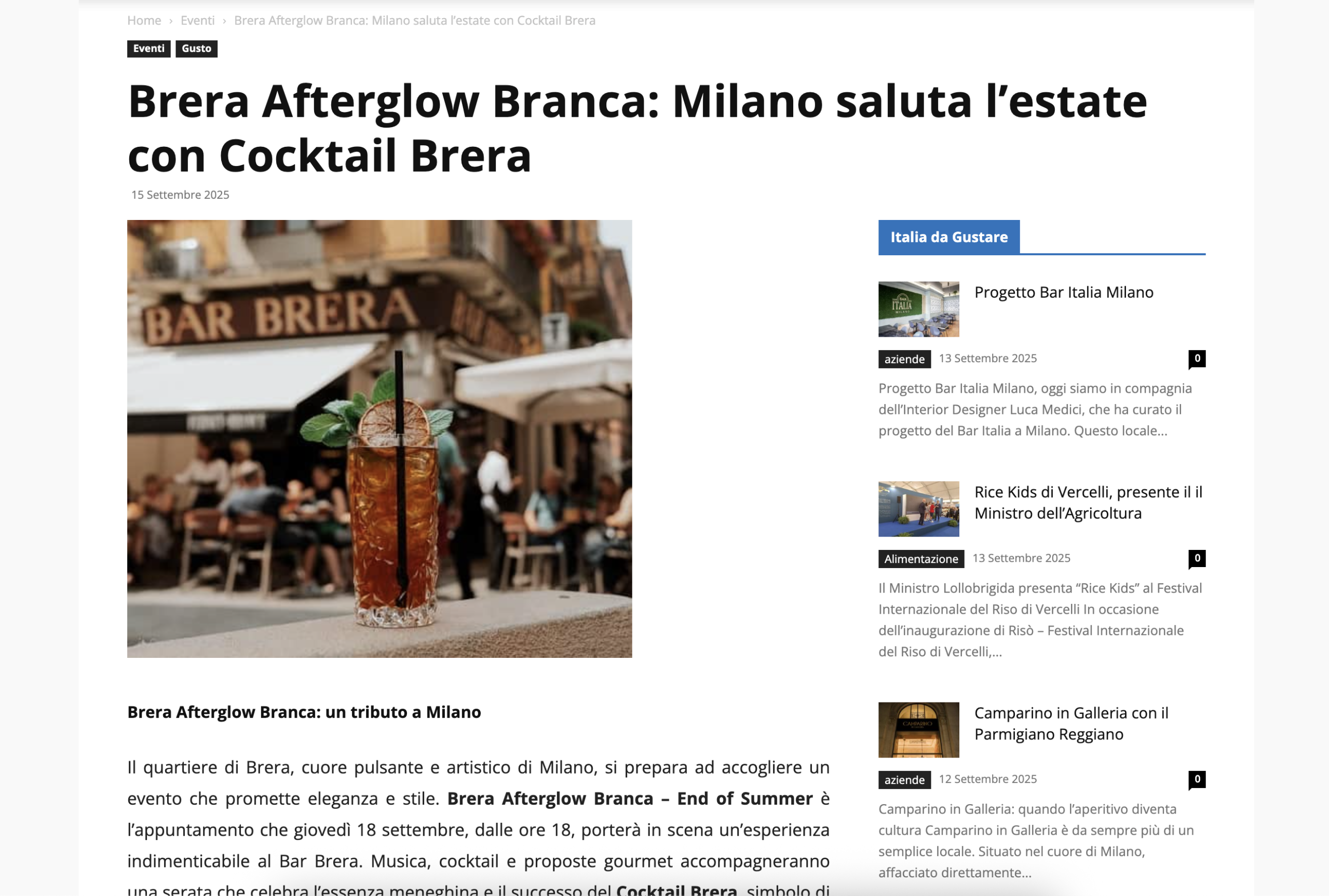22/10/2023 – Un progetto culturale che lega due tra i luoghi storici di Milano: Il Bar Brera sigla una partnership con l'Accademia di Belle Arti per promuovere l'interesse per l'arte e convincere sempre più persone a unirsi alla comunità di un quartiere storico. Per celebrare la collaborazione il bar, uno dei luoghi simbolo della "Milano da bere", ha dato vita a un nuovo cocktail a base di ingredianti Branca.....